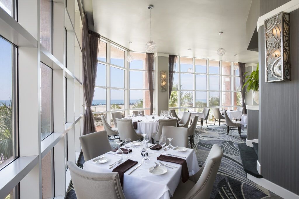 Voyagers is in the Perdido Beach Resort and offers a refined dining ambiance with breathtaking ocean views. The interior carries the languid charm of the coast—a palette of soft blues and sandy tones reflects the beachside locale.