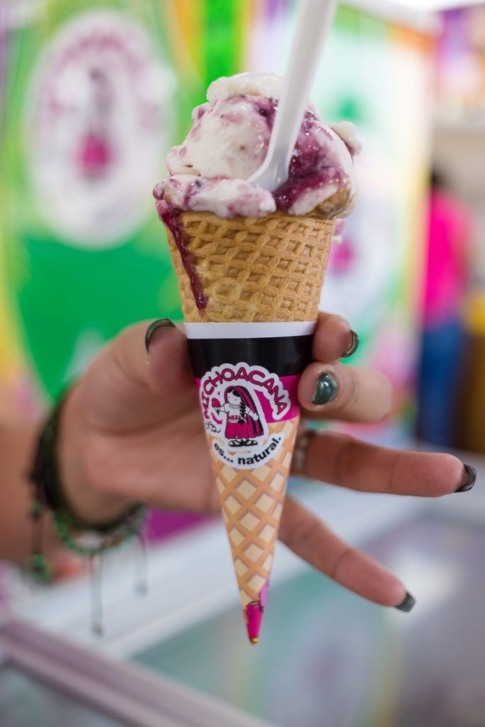 A lot of things are surprising and different, yet familiar too at La Michoacana, the chain of ice cream stores found throughout Mexico, and one of the first and most successful franchises to come from that country. Like a lot of places in the U.S., you can stare through the glass at the tubs of ice cream, have a sample and get a cone or cup.